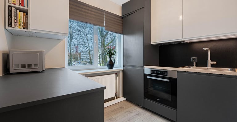• Pilnai įrengta virtuvė su buitine technika – orkaitė, kaitlentė, šaldytuvas, indaplovė