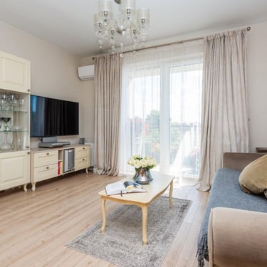 Visiškai įrengtas, parduodamas su baldais ir buitine technika (indaplovė, skalbyklė, kondicionierius, šaldytuvas);