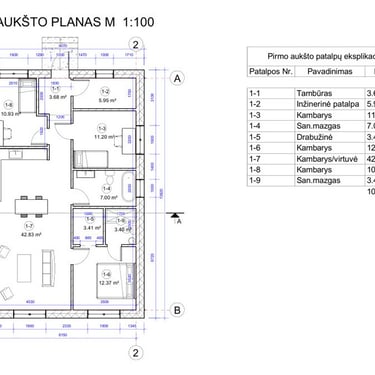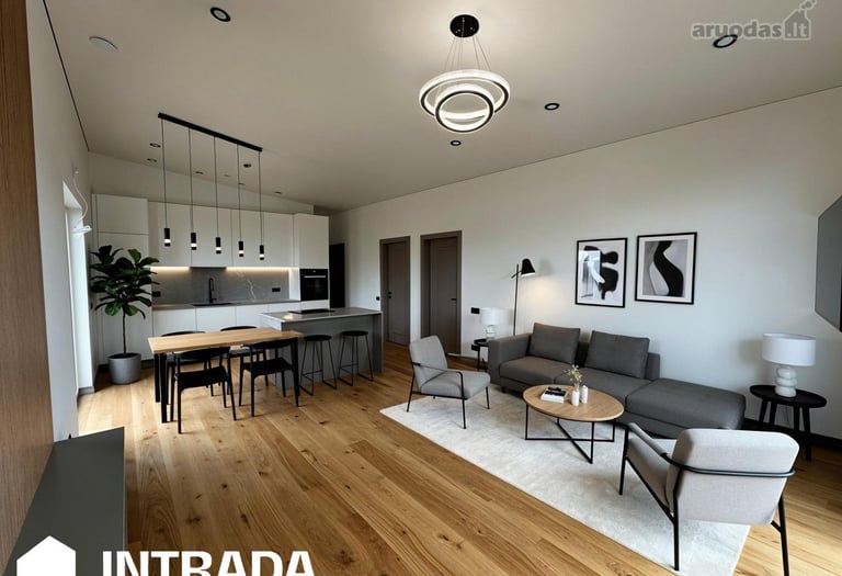 Kambariai: svetainė su virtuve ir valgomojo zona, 3 miegamieji, 2 sanitariniai mazgai