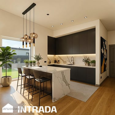 Erdvi svetainė su virtuvės ir valgomojo zona – namų centras bendram laikui kartu.
