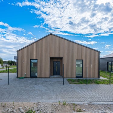 Fasadas dekoruotas akmens plytelėmis ir medžio apdaila