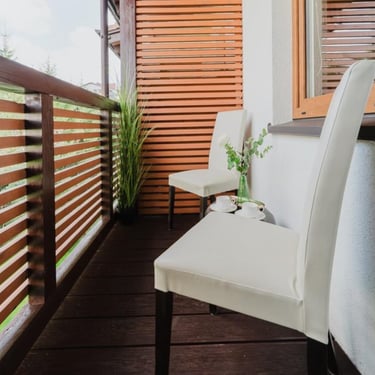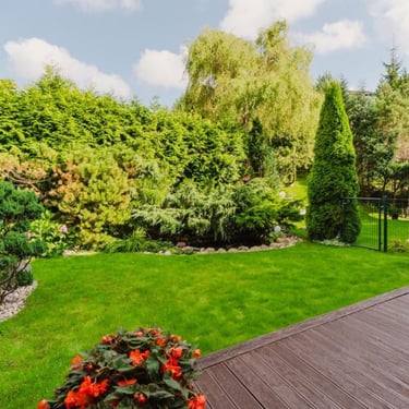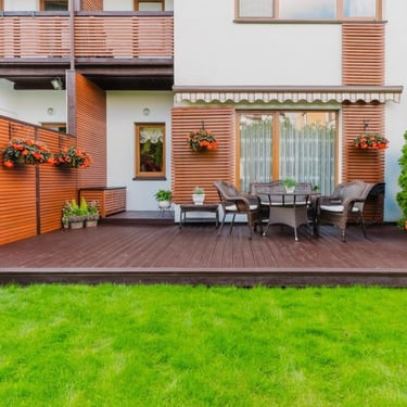 Jaukus kiemelis su didele medine terasa, markize, lauko baldais, kepsnine, išpuoselėta augmenija ir alpinariumu